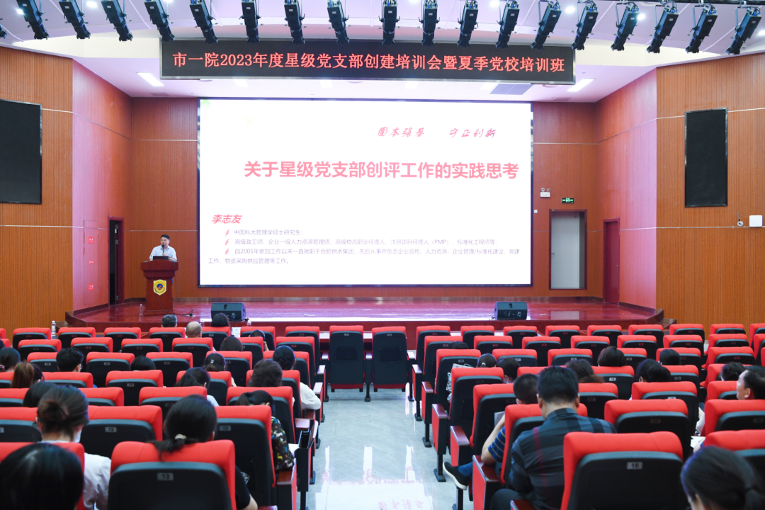 为深入推进2023年星级支部创建活动,打造优质党建战斗堡垒,推动党建工作与业务工作的深度融合,用高质量党建引领保障医院高质量发展,5月18日下午,合肥市第一人民医院在本部院区负二楼会议中心举办了“2023年度星级党支部创建培训会暨夏季党校培训班”,本次培训会议邀请了合肥供水集团物资公司党支部书记李志友前来交流指导创评工作,院领导、各党总支、党支部书记及部分支委参加了此次培训会,党委委员李玲致辞。